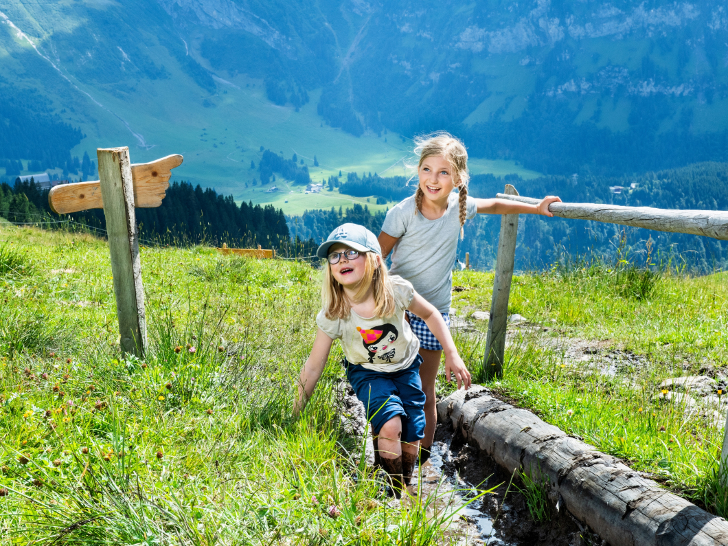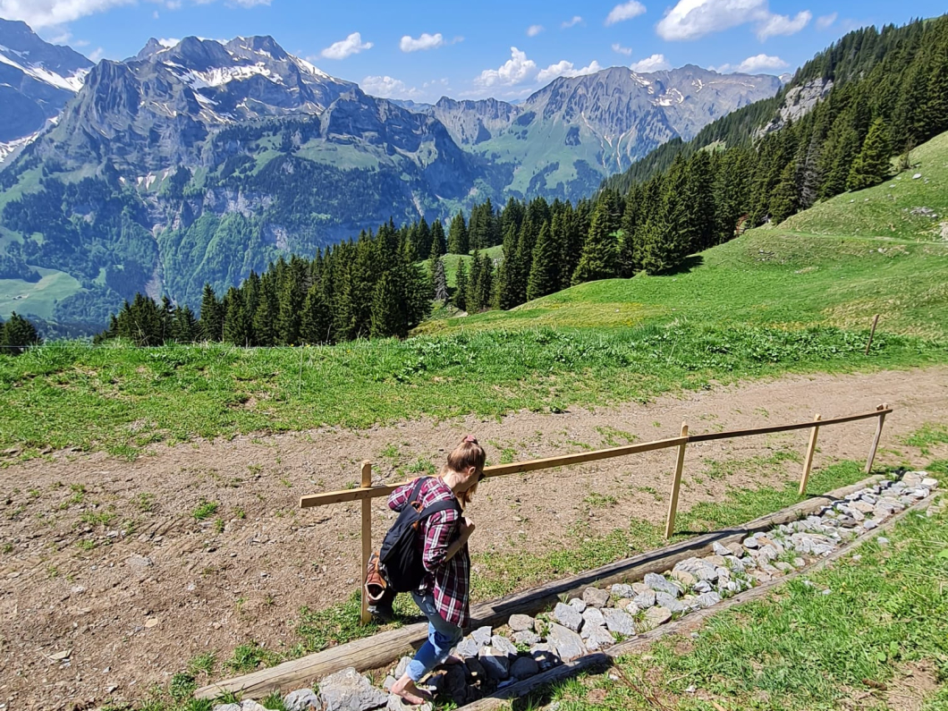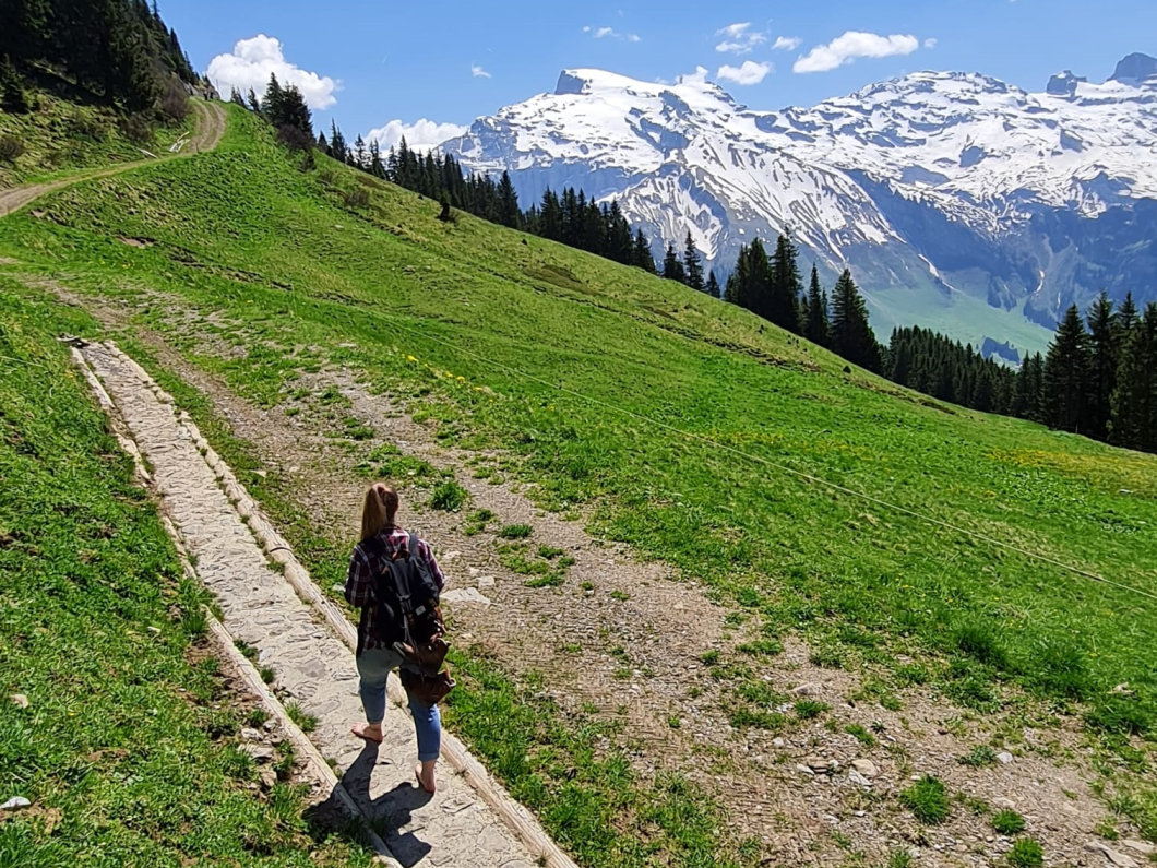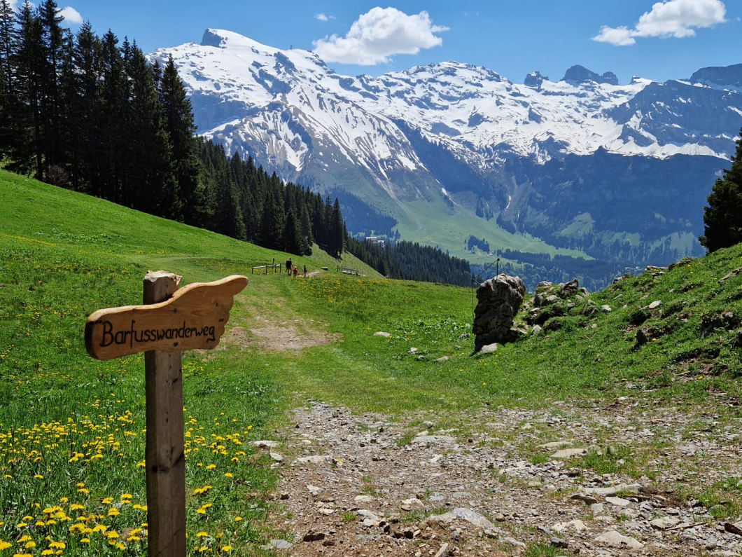 Der Barfusswanderweg startet bei der Hüttismatt und führt auf einem bestehenden Wanderweg hinauf in Richtung Brunnihütte.