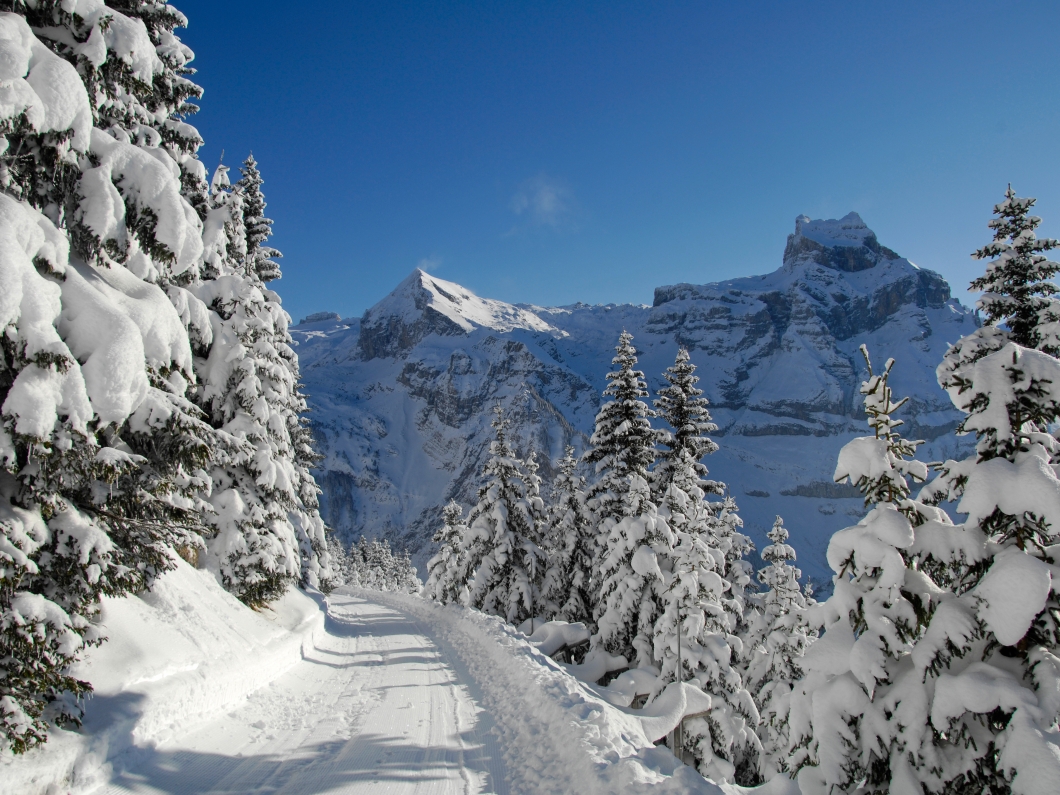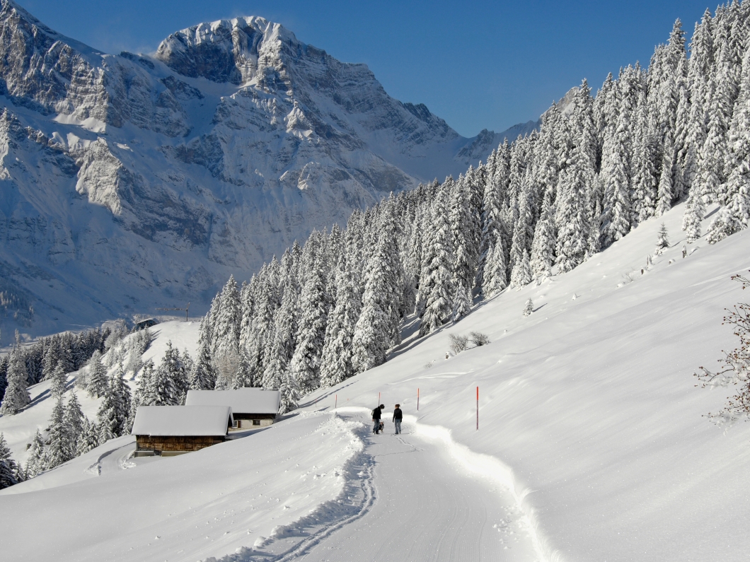 Der Winterwanderweg vom Ristis über die Rigidalalp hoch zu der Brunnihütte SAC ist ein schöner Panoramaweg und führt über einen breiten Weg.