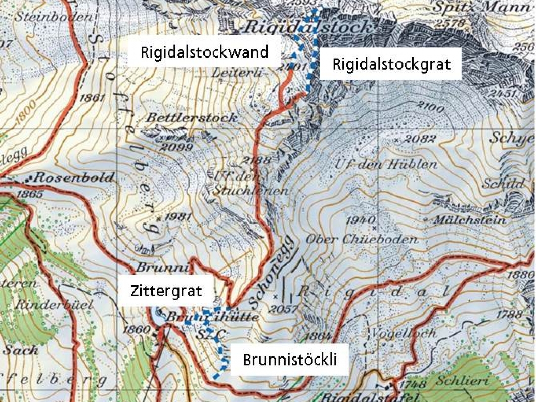 Beim Härzlisee vorbei am Wegweiser «Rigidal-Klettersteig» auf dem markierten Bergweg oder über einen der Klettersteige Zittergrat oder Brunnistöckli aufsteigen. Von der Schonegg links dem Wiesenrücken entlang bergauf bis zu einer Verzweigung. Der linke Weg führt zum schwierigeren Klettersteig
