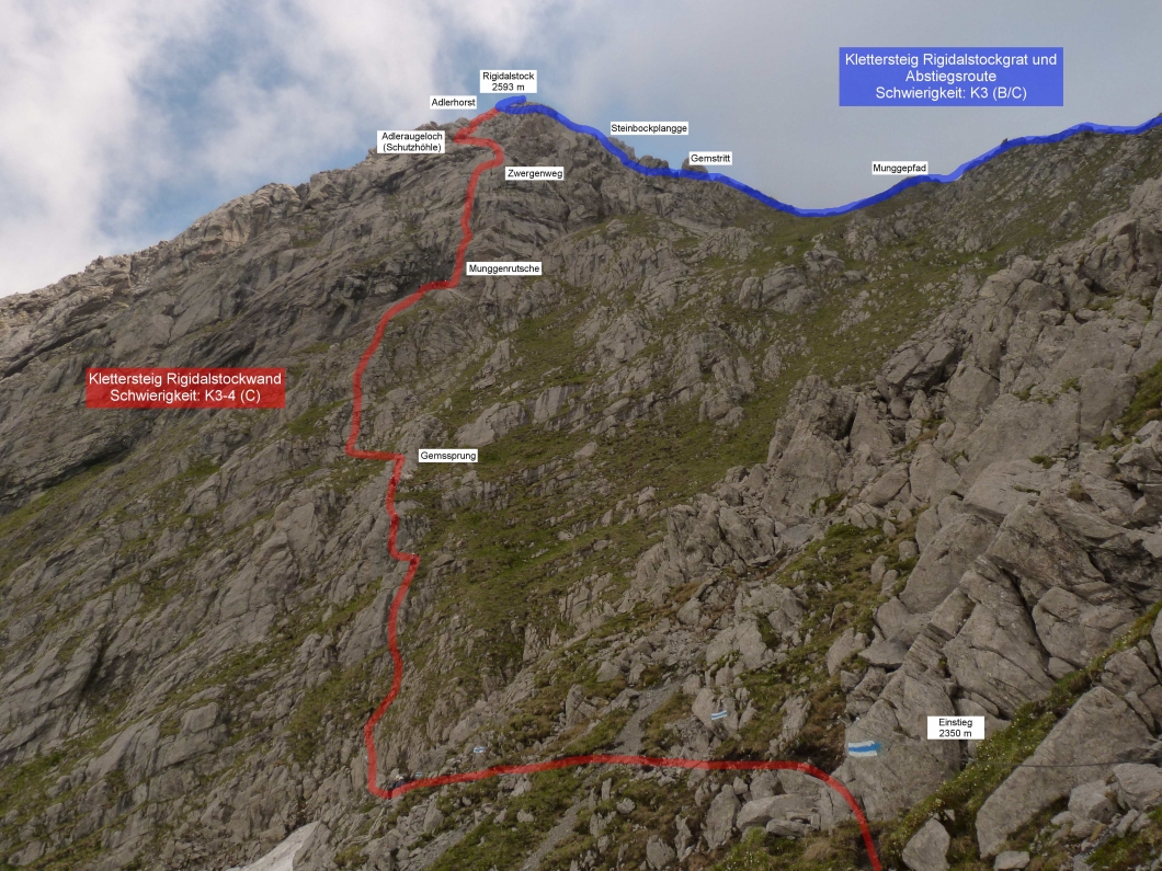 erfolgt über den Klettersteig Rigidalstockgrat.