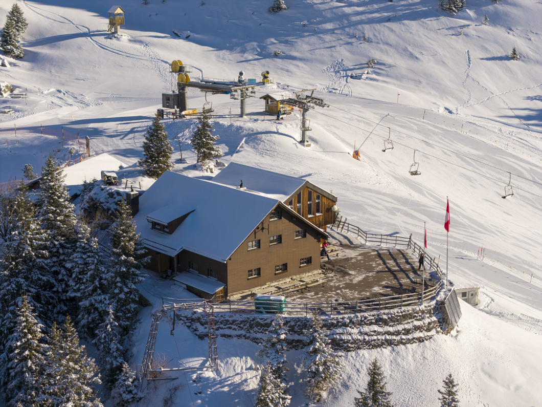 Die Brunnihütte liegt auf 1'860 m ü. M. Mit dem Sessellift ist sie ganzjährig erreichbar und ist ein idealer Ausgangspunkt für sportliche Aktivitäten und gemütliches Zusammensein.